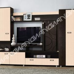 Компактная и удобная стенка, которая не займет много места даже в небольшой комнате. Комплект мебели включает в себя: просторный шкаф со штангой и полкой; центральную секцию с небольшим пеналом для книг и сувениров, а также полку и тумбу под телевизор.